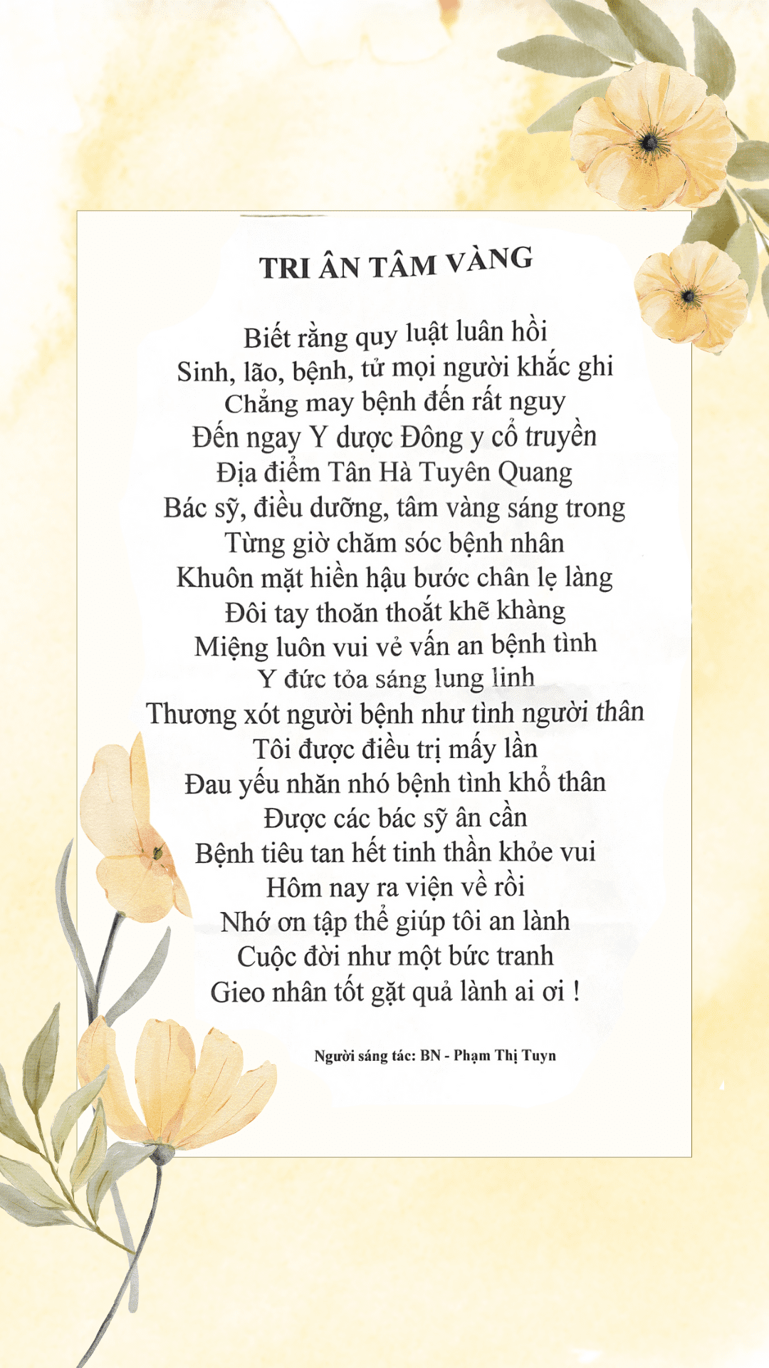 Bệnh viện Y dược cổ truyền tỉnh Tuyên Quang xin trân trọng cảm ơn Quý người bệnh đã và đang luôn tin tưởng lựa chọn bệnh viện là nơi thăm khám và điều trị trong thời gian qua. Kính chúc Quý người bệnh luôn dồi dào sức khỏe, bình an và hạnh phúc bên gia đình, người thân.