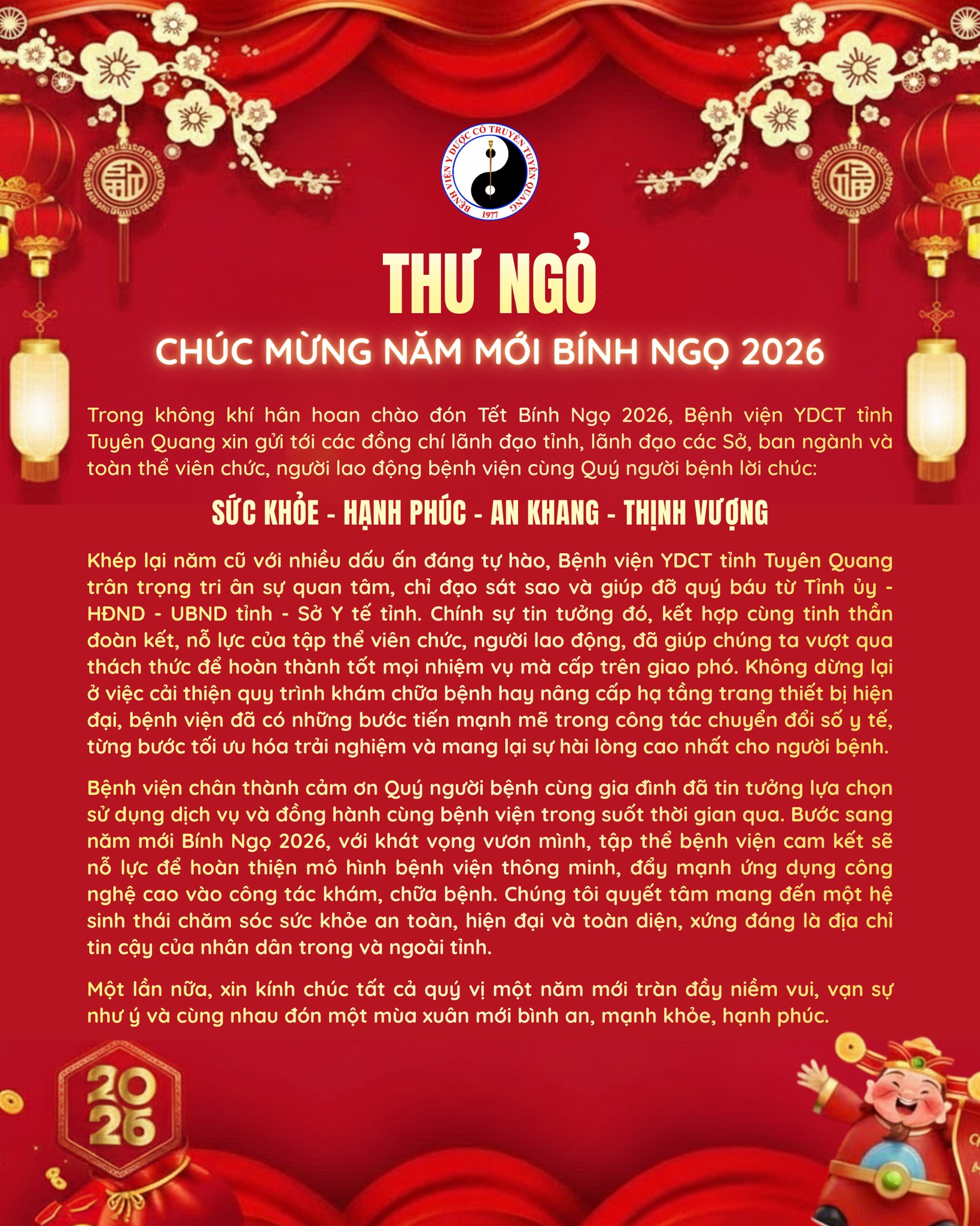 Trong không khí tưng bừng đón chào Xuân mới Bính Ngọ 2026, Ban Giám đốc Bệnh viện Y dược cổ truyền tỉnh Tuyên Quang gửi tới Quý người bệnh, Quý đối tác và toàn thể viên chức, người lao động Bệnh viện cùng gia đình lời chúc mừng năm mới An khang thịnh vượng, sức khỏe dồi dào, thành công trong công việc và cuộc sống.